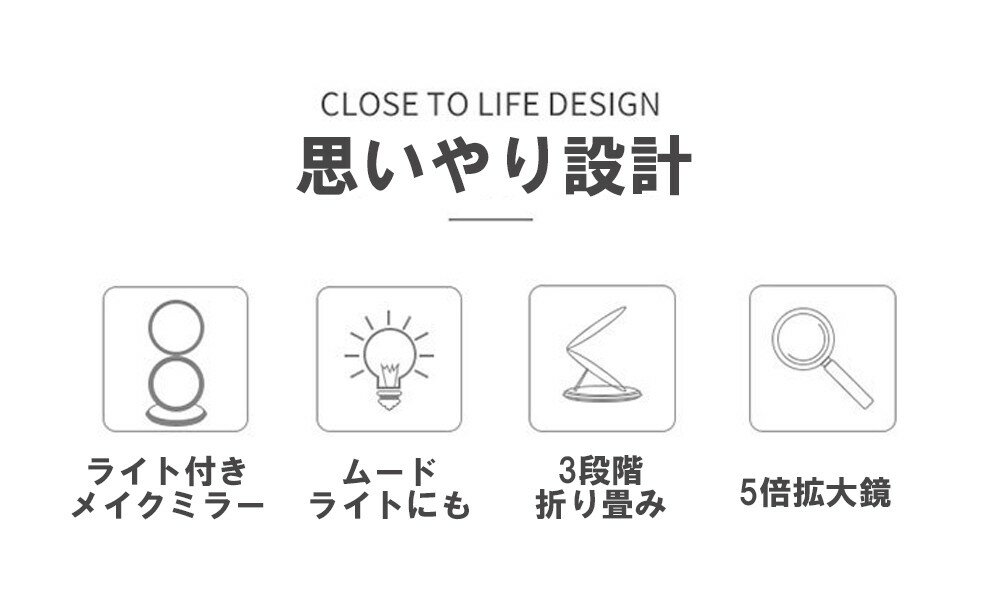 商品説明 サイズ ミラーを開いた状態 高さ:35cm 閉じた状態 縦:17.5cm 幅:16.5cm 高さ:4cm 素材 LEDライト 商品説明 5倍拡大でLEDライト付きのメイクミラーです。